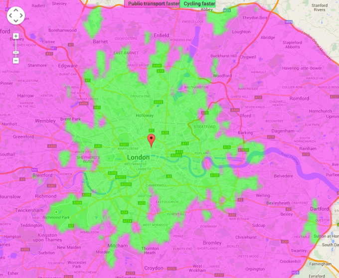 Here’s a map showing routes from the TWC office. Green indicates that a bicycle would get you to that destination more quickly. For context – Edmonton cemetery is just within the northern-most tips of the main green blob and it is 9.3 miles from the office.