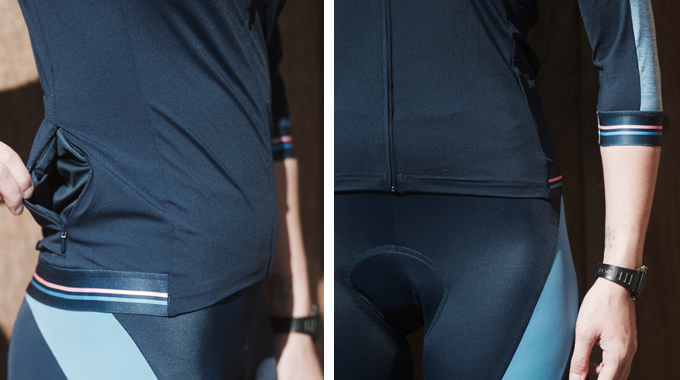 At the back of the jersey, there are three cargo pockets for storage with a zipped stash pocket for essential items. The centre back length is approximately 62/63 cm making it a little longer, providing ample coverage when you’re really pedalling down hard.