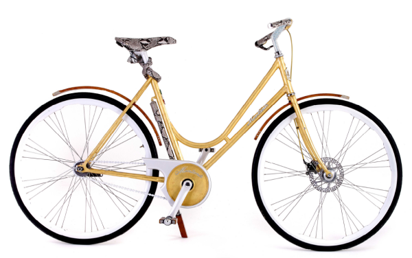The stylish Italian bike manufacturer Montante has thrown its weight into the gold-plating business, producing this, a classic ladies-about-town bike, finished with the now-ubiquitous 24k gold plating and 11,000 Swarovski crystals.