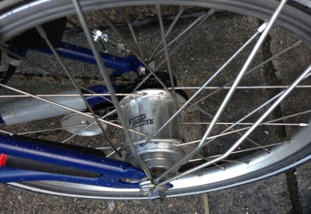 Bromptons come with a quality Sturmey Archer hub gear. If you haven’t encountered this type of gear before, they’re worth knowing about because they are brilliant for city riding. Rather than the familiar set of cogs, the gears work inside a fully enclosed drum, which means considerably less maintenance.