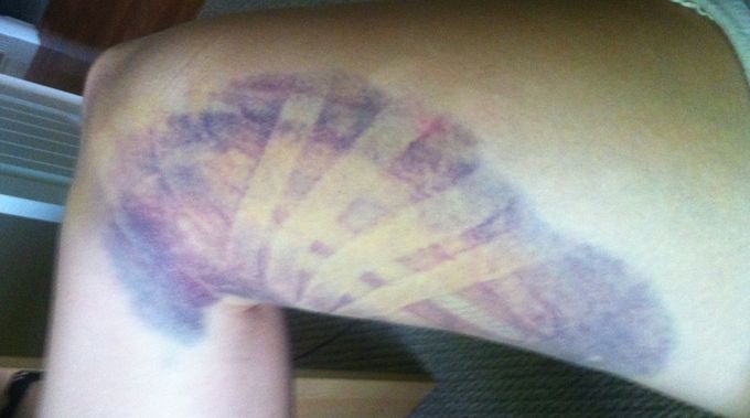 The pain when leaning on the bruise (girls gotta sleep!) and when pedalling (can’t keep me off the bike long) were decreased within around four days. Eventually, it was time for the tape to come off – and the improvement where it had been placed was clear: