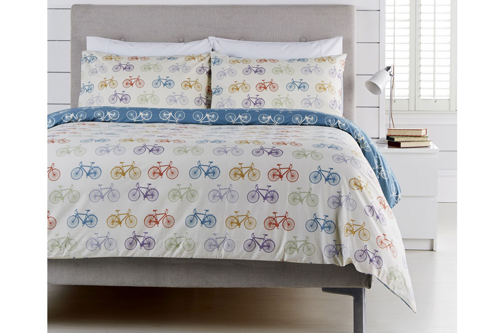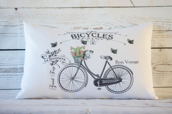For anyone searching for a bicycle themed pillow or pillowcase, there are A LOT of options out there. But we really liked this made to order pillow from DelightfulVintageUK. It’s 12×18 inches, made from Polycotton fabric and costs £6.99. See it here.