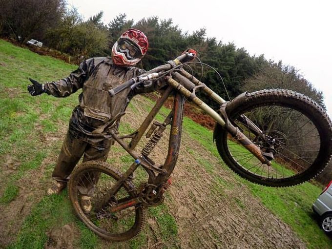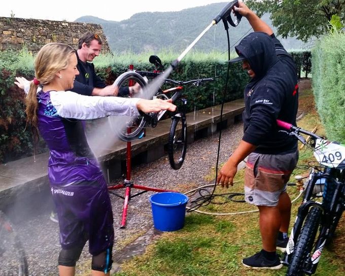This great photo of the Scottish MTB rider, Hannah Barnes, shows us the pro way to carry out a post-ride clean up operation after a very messy ride. Having to be hosed down after a riding session displays a high level of commitment- we bet that water isn’t warm!