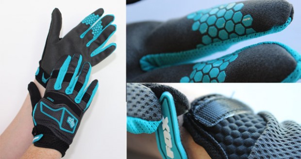 There’s no padding on the palm, which is made of a faux-suede material, with contrasting teal silicone grip patches on the two first fingers of the hand to aid grip on the brake levers.