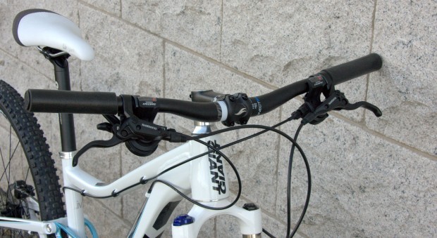 The bikes wide, low-rise handle bars are good for technical riding, but can be a stretch for smaller riders and are less comfortable on the shoulders on longer rides. The smooth handlebar grips are another ‘latest‘ style; not my preferred choice, and a bit slippery when wet or when you are trying to lift the front of the bike over obstacles.