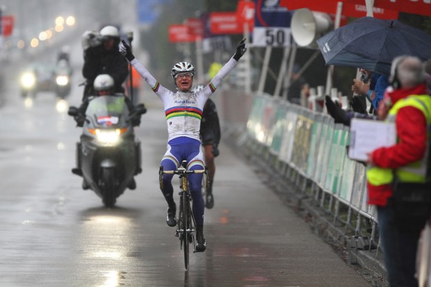 As they entered Hoogeveen in the torrential rain, Vos and Van Dijk had the roads to themselves. Van Dijk is a superb sprinter, and Vos knew that, taking her by surprise at 500m to go, speeding past her with plenty of time to celebrate. Despite the awful conditions, she looked ecstatic, as, arms in the air, she won her third Ronde van Drenthe, and her first World Cup of the year.