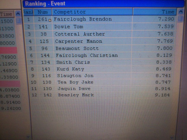 The problem with beating my goal for that day in the first round meant that I wasn’t happy with it anymore. Top three had been dangled in front of my face and I wanted it. I wasn’t too far behind Scott but I’d have to find 0.2 to beat Arthur which is hard on such a short track. Third round came around and I was sat on the start. After a warm up lap I got up to speed and went through the beams to start the clock… 7.769 seconds later it stopped when I crossed the line.