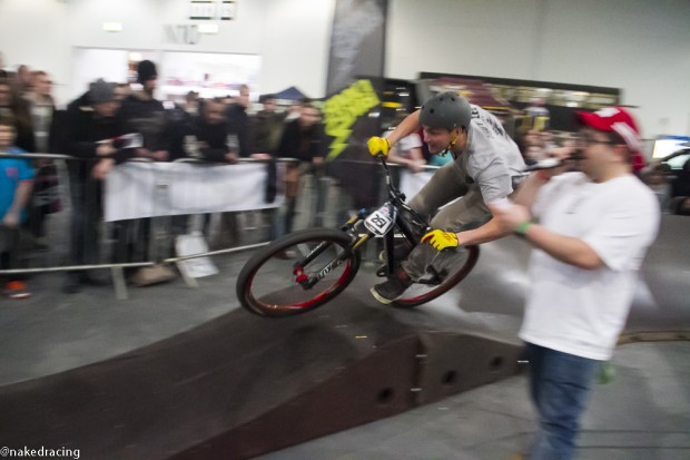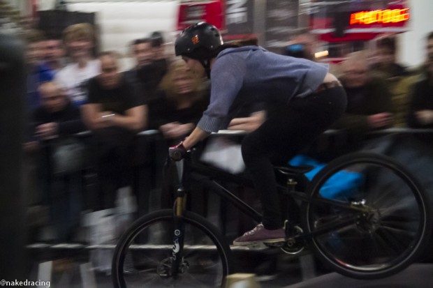 I turned up late so by the time I found the pumptrack area (after a few accidental detours through the Boat and Travel Shows) people were already riding. The pumptrack was made up of wooden segments, designed really well with smooth rollers and curved berms so riders were absolutely flying round. First few laps of practice felt as crazy as the last race laps. All it took was a couple of good pumps over the rollers and you were straight up to speed. The near-vertical berms spat you out at all angles so if you didn’t react quick enough you were sent careering off the track!