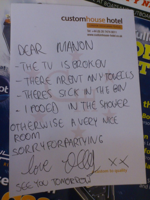 That night Chris Roberts very kindly sorted us out a hotel room which involved kicking Olly Wilkins and his girlfriend out of the room they had stayed in the night before. They’d obviously had a heavy night so Olly left us a lovely message apologising for the state of the room…