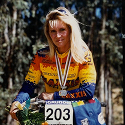 Kathy Sessler is best known for being the Santa Cruz Syndicate team manager, but before managing the team she had a successful downhill career in the 1990’s. Two-time unofficial vet World Champion and three-time vet National Champ she has also performed stunts in films; Living in Fear and She’s No Angel in 2001 and Born to ride in 2011. She was the first ever ‘Maxxis girl’ and her best pro result was 10th at the UCI World Cup at Mammoth in 1994.