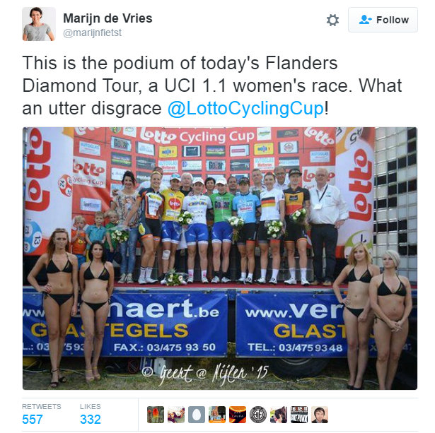 Other races of course will continue with the tradition – for now, but it’s clear female riders and fans aren’t happy. Last year, Marijn de Vries drew attention to the rather cold looking models at the Flanders Diamond Tour in Belgium, drawing well over 500 re-tweets.