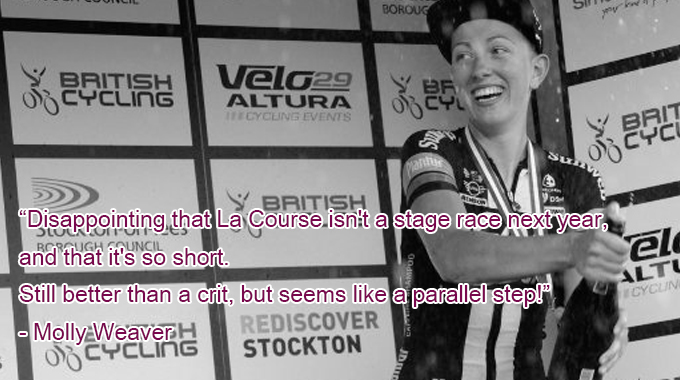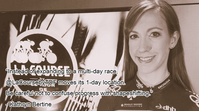 Liv Planteur cyclist, Molly Weaver shared her thoughts about Aso’s La Course announcement, as did Kathryn Bertine who helped get the wheels in motion for a women’s TDF…