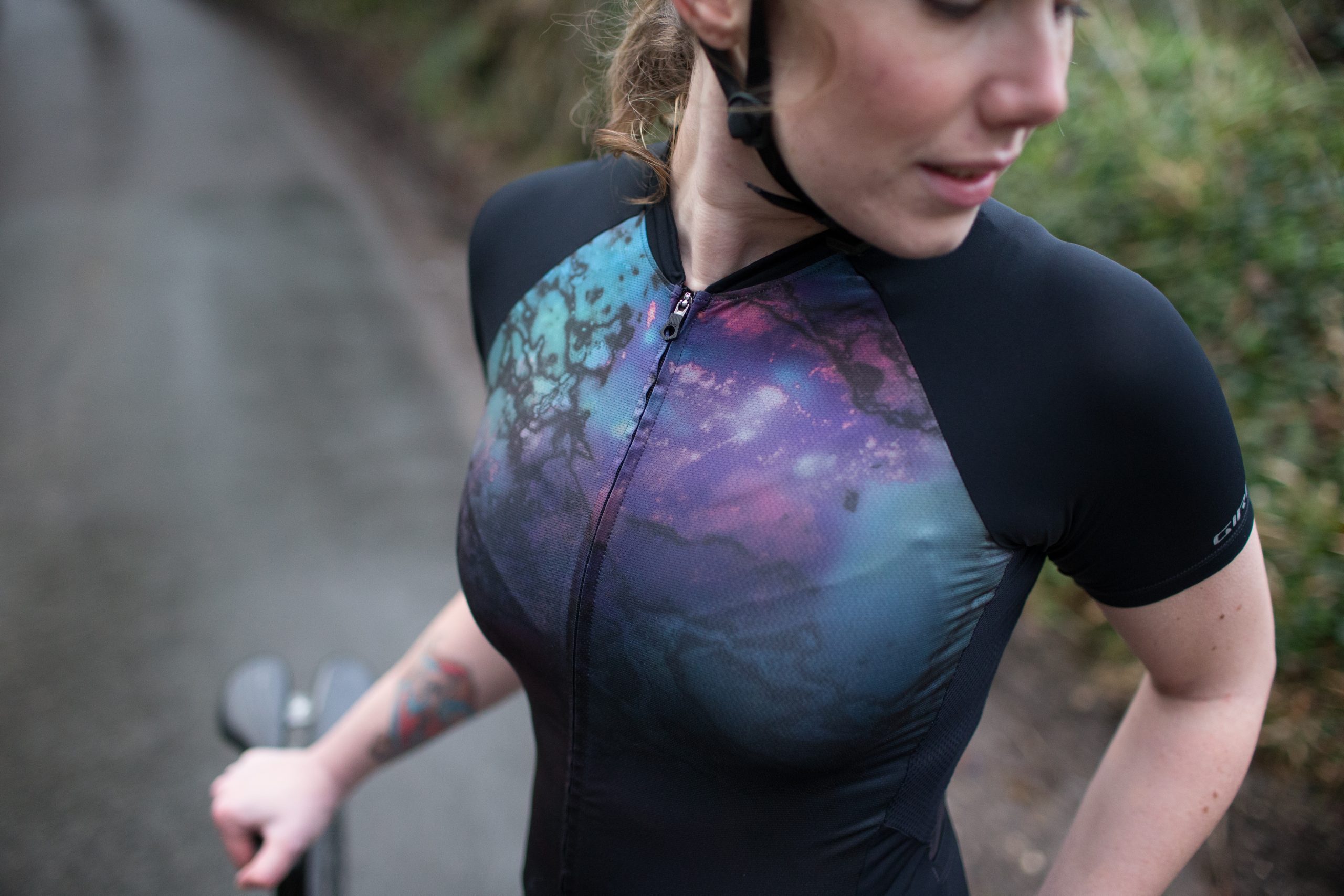 There’s a wide range of jerseys, but our absolute favourite has to be the Chrono Pro in its Galaxy Print (£139). Giro worked with their Italian production company to create their own unique fabric mix, and they came out with the perfect partnership of polyester and elastane that offers a race-fit aero fit that doesn’t flap around, but also wraps around the contours of a woman’s body to create a flattering silhouette.