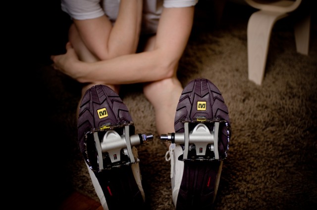 Clipless pedals hold your shoes in place, but you can still twist out easily. Image by Listen Missy!