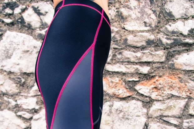 The cut is very flattering with black and grey panels following the contours of the body and contrasting hot pink over-locked stitching. The lycra fabric itself is close fitting, supportive and comfortable, though not very lightweight, making it less ideal for hot summer days.