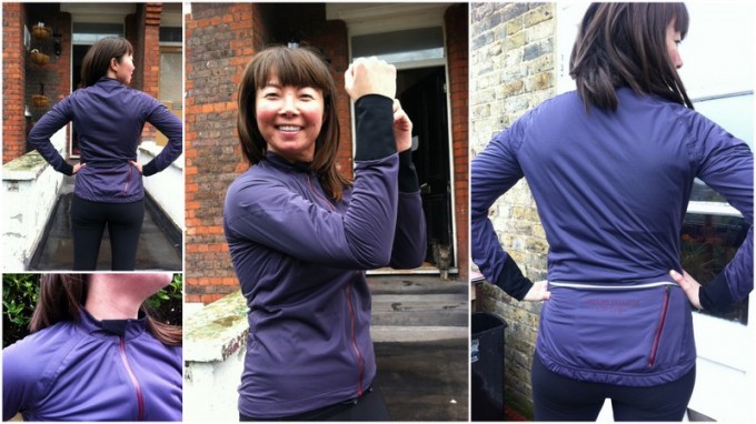 The Colette Rain Jacket is the first jacket I’ve worn that doesn’t make me feel like I’m wearing a tent. The first outing was with a t-shirt and a light wool cardigan underneath, in sunny 16 degree autumn weather. The cardigan had to come off as it was making me too warm. This jacket is not meant for layering! I later tried it over a jersey and it was perfect. It even rolls up small enough to stuff into my jersey pocket!