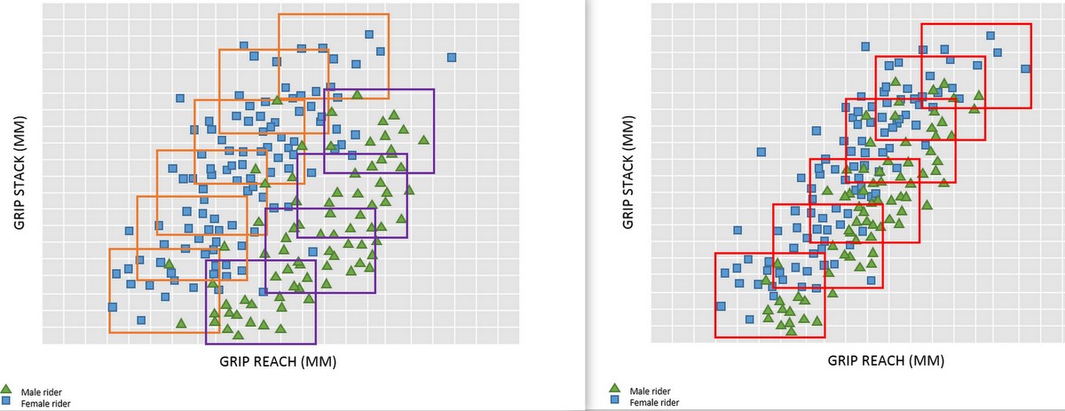 This scatter graph on the right shows (a very condensed view) of what Roubaix customers needed in terms of stack and reach vs Ruby customers. The chart on the left shows the same information for one of the brand’s MTB models…