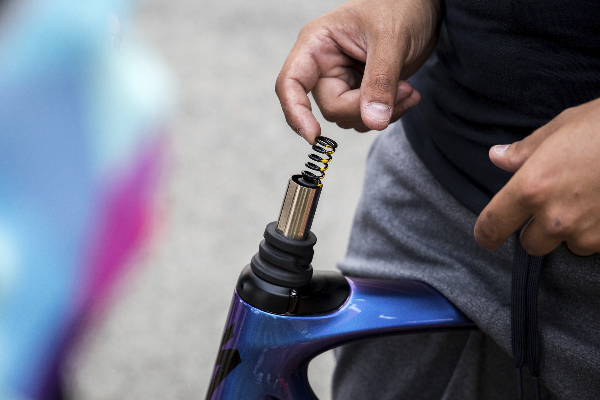 The spring moves up and down as you ride. Specialized carried out a lot of research in this area. They hypothesised that there were two ways suspension could work on a road bike: they could offer ‘splay’ or ‘axial compliance’.
