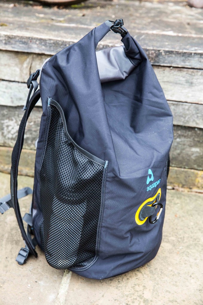 35litres is fairly big – enough to carry a laptop, change of clothes, warm jacket and a meal. The external mesh pockets (there are two of them) will each hold a 2l water bottle. There’s also an full-size waterproof internal pocket ijn the AQUAPAC 35l Wet & Dry backpack to keep wet and dry things (or dirty and clean things) separate – it’s perfect for cycling shoes and a rain jacket.