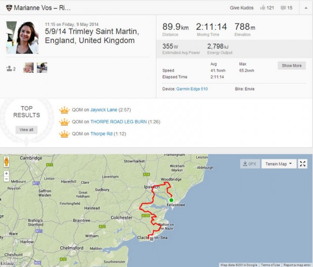 We have been following her Strava uploads throughout the race, and we’re beginning to wonder if there will be a single QOM left in the East of England when she finishes up on Sunday!