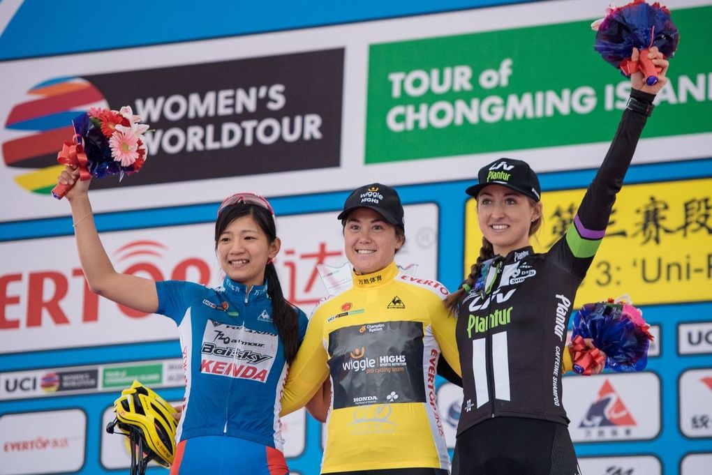 The final GC – Ting Ying Huang (Chinese Tapei team), Chloe Hosking (Wiggle High5) and Leah Kirchmann (Team Liv-Plantur).